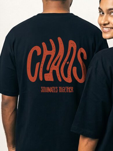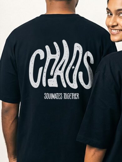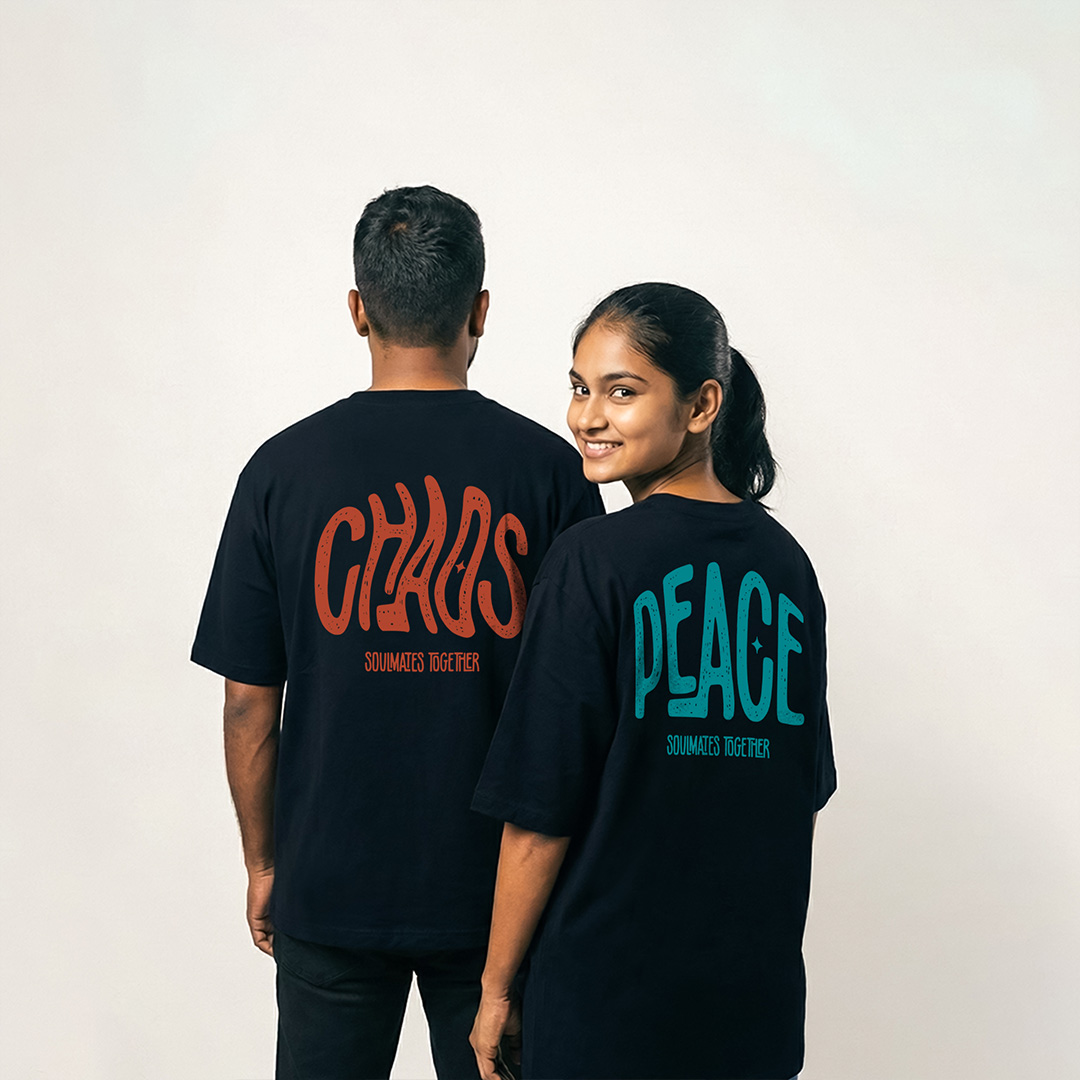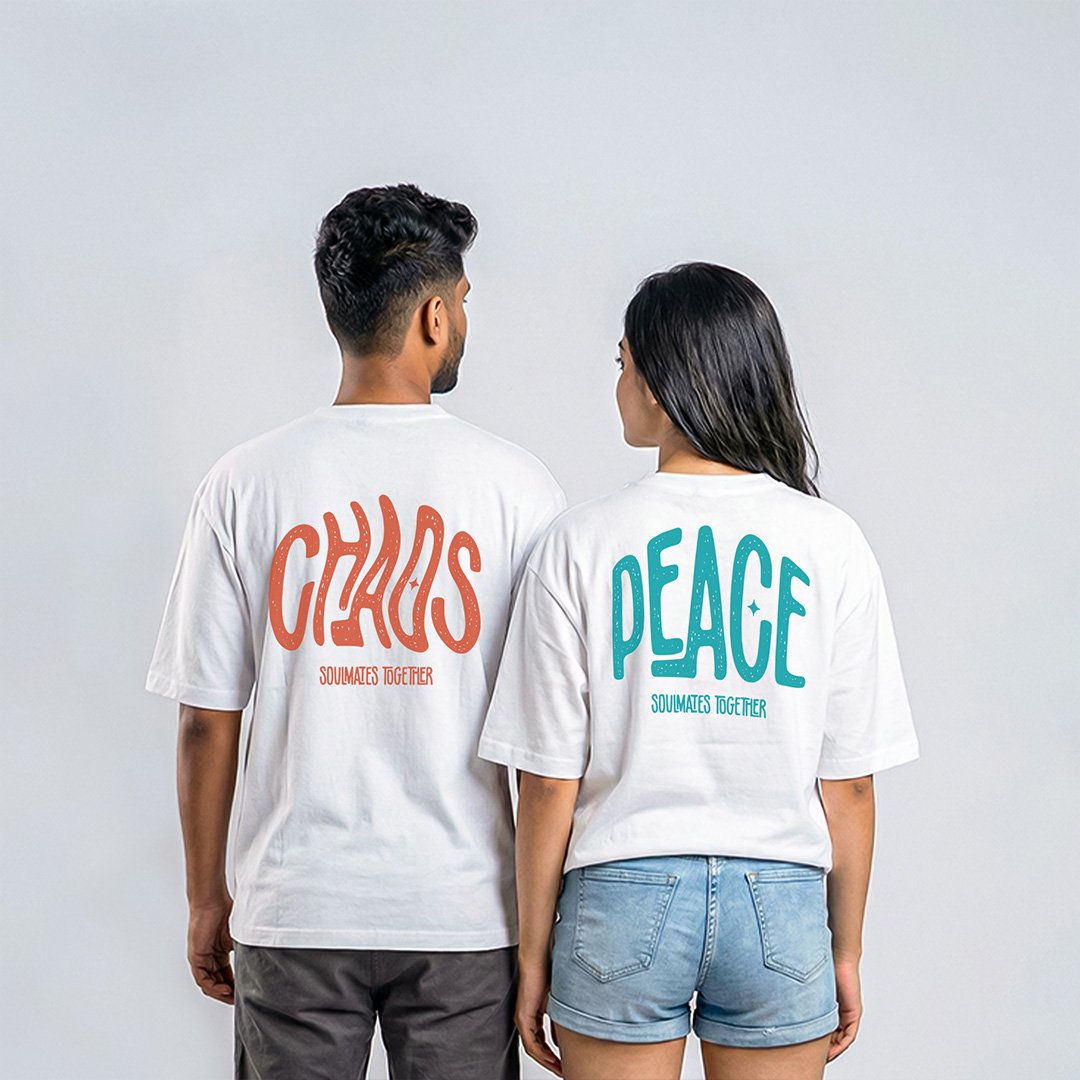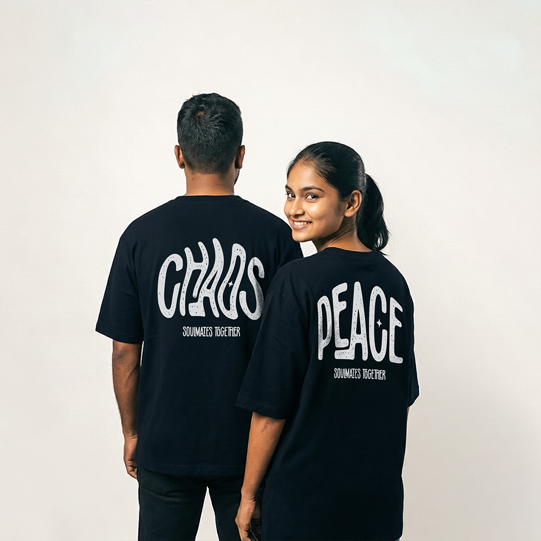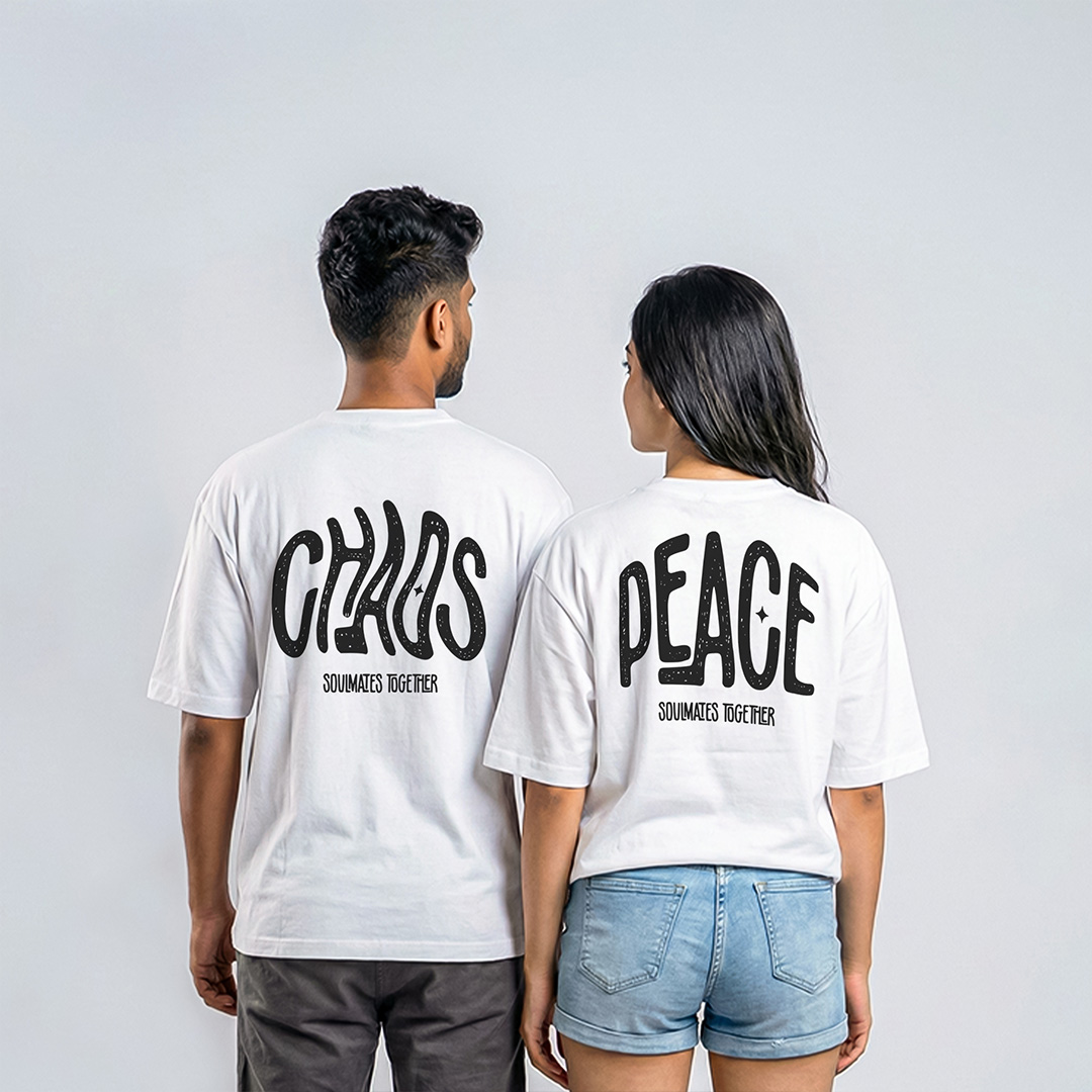 The Vibe High-contrast urban streetwear. This duo uses bold, wavy typography for “Chaos” and structured, calm lettering for “Peace” to visually represent your unique connection.