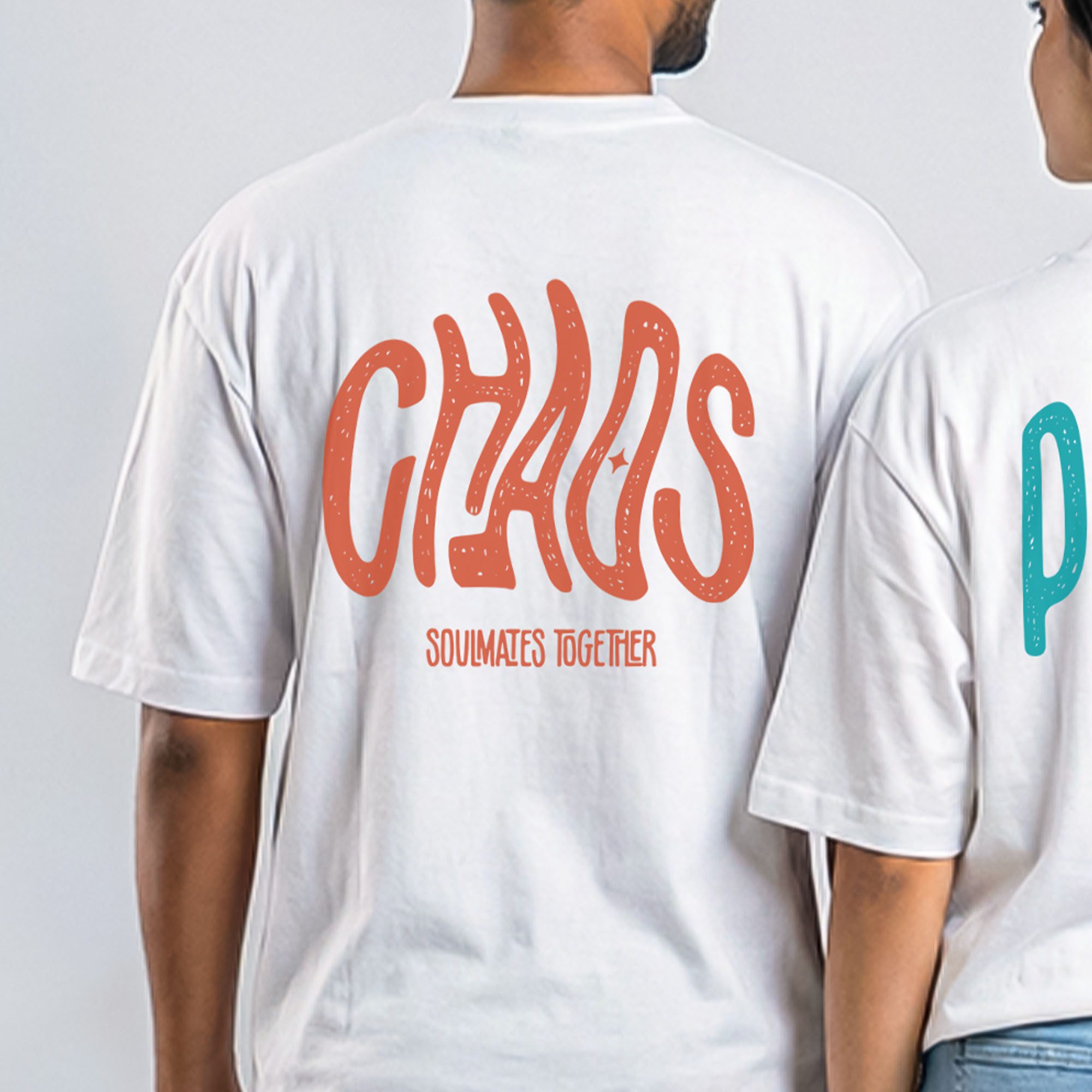 The Vibe High-contrast urban streetwear. This duo uses bold, wavy typography for “Chaos” and structured, calm lettering for “Peace” to visually represent your unique connection.